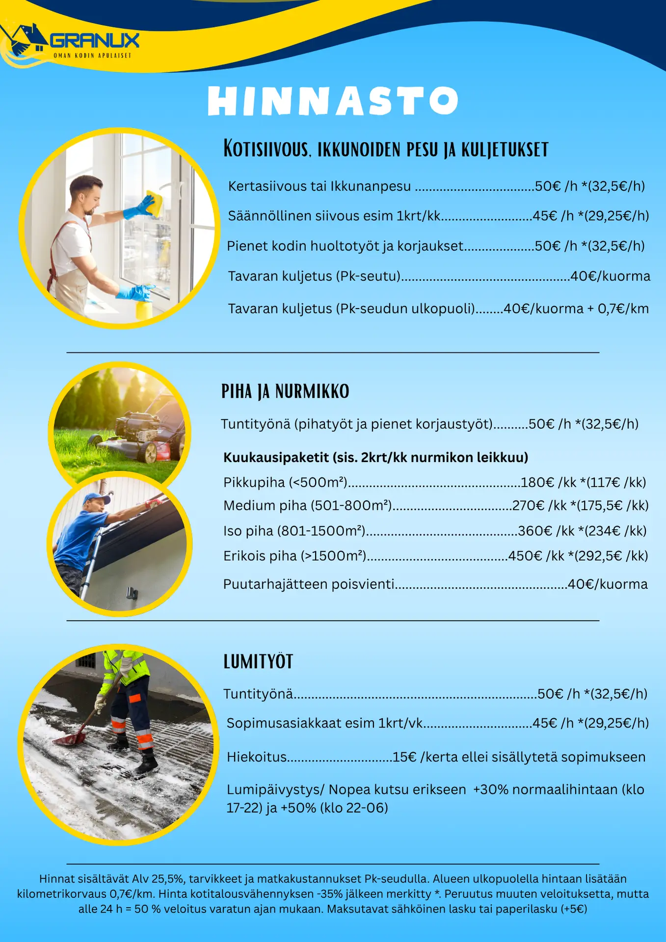 GRANUX, oikealta nimeltään Kiinteistöpalvelut Granlund Oy perustettiin sisarusten ja perheen lapsuudenystävän toimesta vuonna 2025. Olemme yrittäjäperheessä kasvaneita, joka inspiroi meitä nyt perustamaan oman yrityksen.